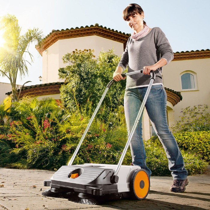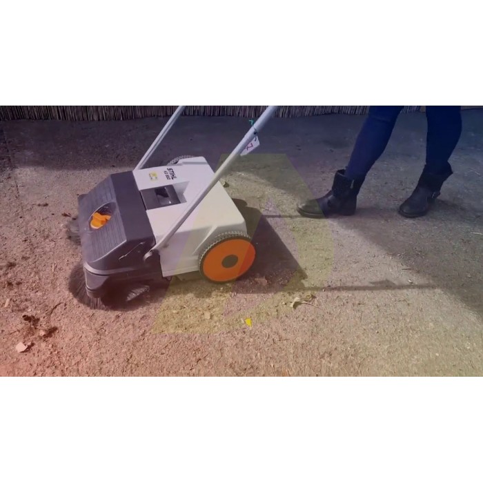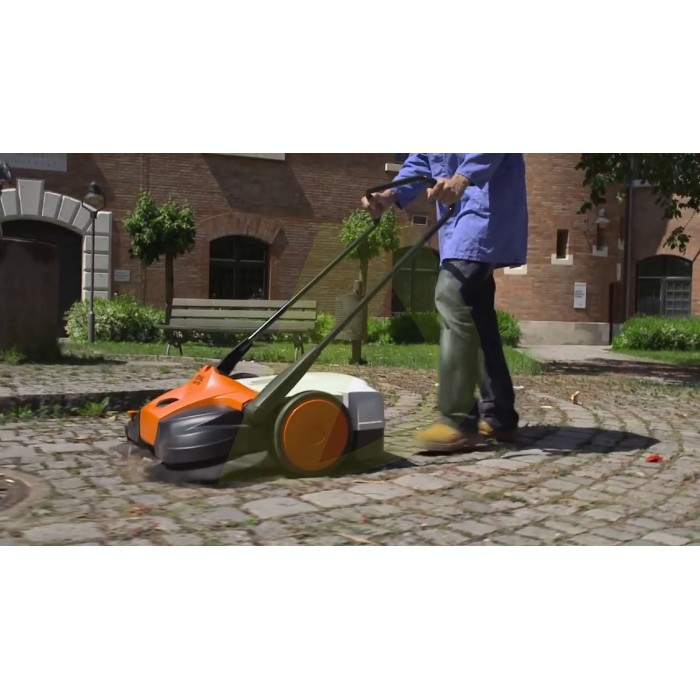 Подметальная машина Stihl KG 550 (48600194705) – это новинка 2016 года. Stihl KG 550 является механическим устройством, предназначенным для уборки практически любой территории площадью до 300 кв. При этом износостойкие нейлоновые щетки отлично справятся с уборкой мусора на ровной жесткой поверхности такой как асфальт, бетонные плиты, брусчатка и так далее, а щетина, выступающая по бокам устройства, качественно очистит углы, а так же по краям и вдоль бордюров. Ширина захвата двух нейлоновых щеток подметальной машины Stihl KG 550 (48600194705) составляет 550 миллиметров, а объем контейнера для мусора 25 литров. Подметальная машина Stihl KG 550 обладает боковыми направляющими роликами, Две дисковые щетки поднимают грязь и перемещают ее прямо в находящуюся за ними емкость. Благодаря тому, что грязь поднимается потоком воздуха перед щетками, грязевые частицы не попадают под агрегат. Даже большой мусор, такой как банки из-под напитков или камней, беспрепятственно оказывается в специальной емкости. Выступающие по бокам щетки гарантируют, что вдоль стен и бордюров также не останется ни ящика. Щетки из износостойкого полиамида имеют очень длительный срок службы. Благодаря их особому расположению щетки поднимают с обрабатываемой поверхности любой мусор, в т.ч. мокрые листья. Благодаря центральной регулировке высоты Вы можете в мгновение ока настроить агрегат в соответствии с видом мусора или обрабатываемой поверхностью. Кроме того, можно регулярно изменять высоту щеток для достижения оптимального результата в течение всего срока службы. Большой объем и высокие мусорные стенки резервуара делают его особенно вместительным. Мусорный резервуар надежно крепится за ручкой на раму. Это предотвращает непреднамеренный стул контейнера даже в процессе транспортировки. За счет прямой передачи КПД редуктора значительно больше, чем у устройств с ременным приводом. Это облегчает управление агрегатом. Даже когда используется задний ход, дисковые щетки двигаются в направлении внутрь, что позволяет избежать выброса мусора. В процессе работы оба боковых ролика позволяют вести агрегат строго вдоль стены или бордюра. Одновременно они надежно предохраняют устройство и ограждение обрабатываемых поверхностей от повреждений.